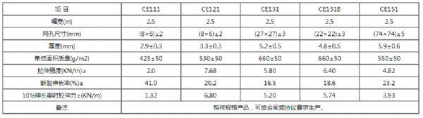 土工網(wǎng): 是高密度聚乙烯經(jīng)擠壓成方形、菱形、六邊形網(wǎng)格狀的產(chǎn)品,具有一定的拉伸強(qiáng)度和耐久性、化學(xué)穩(wěn)定性、耐候性、耐腐蝕等性能。因此可廣泛應(yīng)用于巖土工程的諸多方面。該產(chǎn)品規(guī)格齊全,在此,僅介紹CE131和CE151兩種用途最廣的土工網(wǎng)。 用途: CE131 1. 用于路基補(bǔ)強(qiáng),使粒狀填料與網(wǎng)格互相鎖合在一起,形成穩(wěn)定的平面,防止填料下陷,并可將垂直載苛分散,地理?xiàng)l件惡劣地區(qū)可采用多層補(bǔ)強(qiáng); 2. 鋪于堤壩及路基填土中能增加它的穩(wěn)定性,減少占地面積; 3. 用于路面補(bǔ)強(qiáng),使網(wǎng)格與路面材料摻合在一起,可以有效地分散傳遞載荷,防止路面裂紋; 4. 可承受一定沖擊載荷; 5. 可承受較大的交變載荷; 6. 縮短工程建設(shè)周期; 7. 在惡劣環(huán)境條件下,也能施工; 8. 可防止翻漿造成的路面沉陷和裂紋; 9. 可減少路面材料用量; 10. 加快施工速度。 CE151 1. 堤壩及巖石表面的防護(hù)。以防止侵蝕作用,避免產(chǎn)生塌方、巖石松動(dòng)和水土流失; 2. 河、道岸治理工程,因具有柔韌性強(qiáng)、滲透性好、不受海水侵蝕,并能吸收波浪沖擊能量,故可做成矩形、方形或管狀石 籠,直接安裝在水下,起導(dǎo)流和防護(hù)作用,施工時(shí)不需要費(fèi)用昂貴的潛水作業(yè); 3. 隧洞周壁的噴錨防護(hù)網(wǎng)。 產(chǎn)品規(guī)格及性能參數(shù):